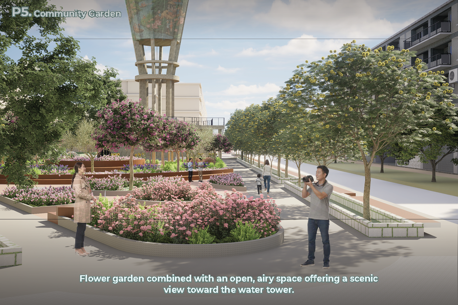 The design strategy focuses on restoring open-space structures, expanding green areas, and encouraging community engagement. Key design elements include a riverside community garden, children’s playground, multi-functional gathering space, public parking area, green façade renovation, and preservation of the historic water tower as a symbol of local memory.